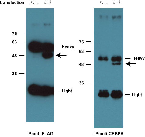 ・内因性CEBPAは、rabbit anti-CEBPA (14AA) IP→mouse anti-CEBPA