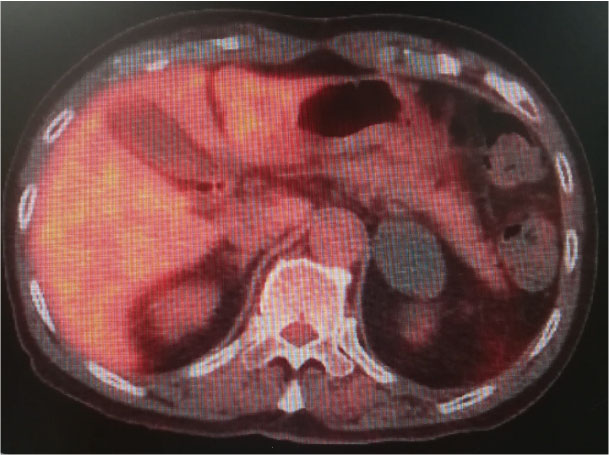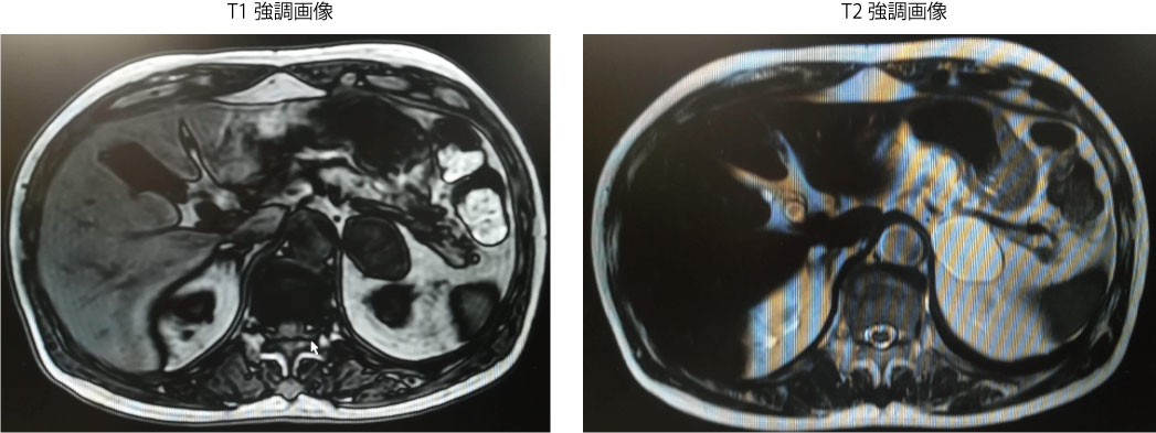 ・腹部CT:46 x 36mmの左副腎腫瘤。20HU