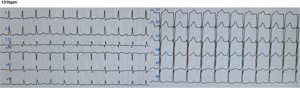 男性。心筋梗塞既往。ペースメーカー留置。2週前から頻脈。本日、人間ドック。1週後、アブレーション予定。