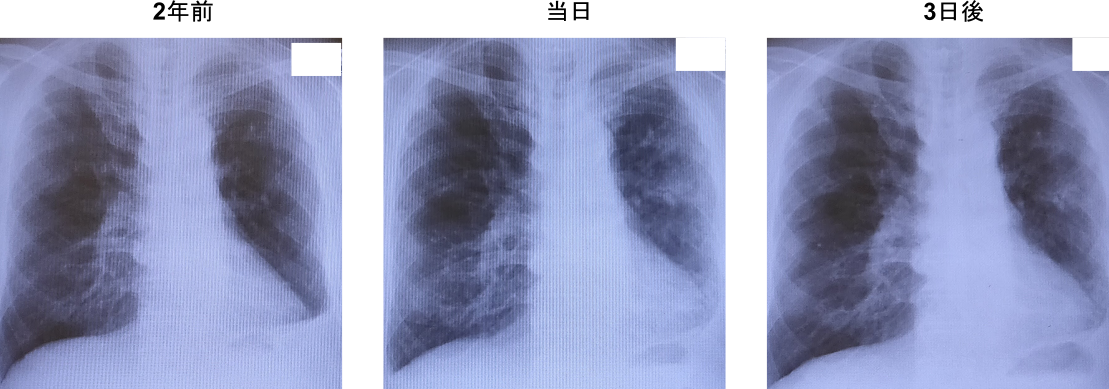 80歳。男性。糖尿病、高血圧、パーキンソン症候群、肺気腫で治療中。1か月程前、咳、痰が増悪し、近医で加療開始。7日前、転倒し、肋骨骨折。本日、定期受診。息苦しさの訴えあり。