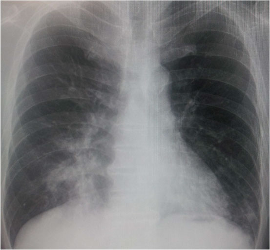 ・胸部Xp:両下肺野に浸潤影、粒状影