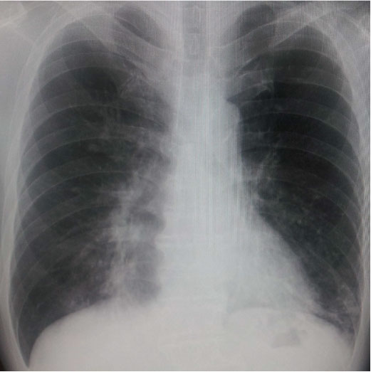 69歳。男性。2年前、胸部Xpで異常指摘され、胸部CTの後定期フォローされていた。今回、先端巨大症疑いで入院。呼吸器症状は認めず。
