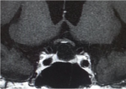 75歳。男性。14年前、ラトケ嚢胞指摘され、最近視野が狭くなってきた。1年前から5回、Na 110-120の低Naを生じた。甲状腺癌術後でチラーヂン服用中。